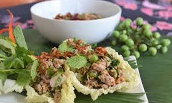 It can be served raw or cooked, according to personal taste. Each ingredient is minced very finely or ground in a mortar and pestle. It’s fun to watch a busy kitchen with the muffled noise of the mortar and the powerful smell of roasted chillies. Fresh herbs, lime, roasted and crushed rice powder, chillies, and various sauces are integrated into laap and give it a rich, fresh and powerful flavour. Gourmets will be delighted by this extraordinary discovery. Like most dishes, laap is served in the middle of the table and shared between diners, who enjoy it with fresh vegetables and sticky rice presented in a woven rattan basket.